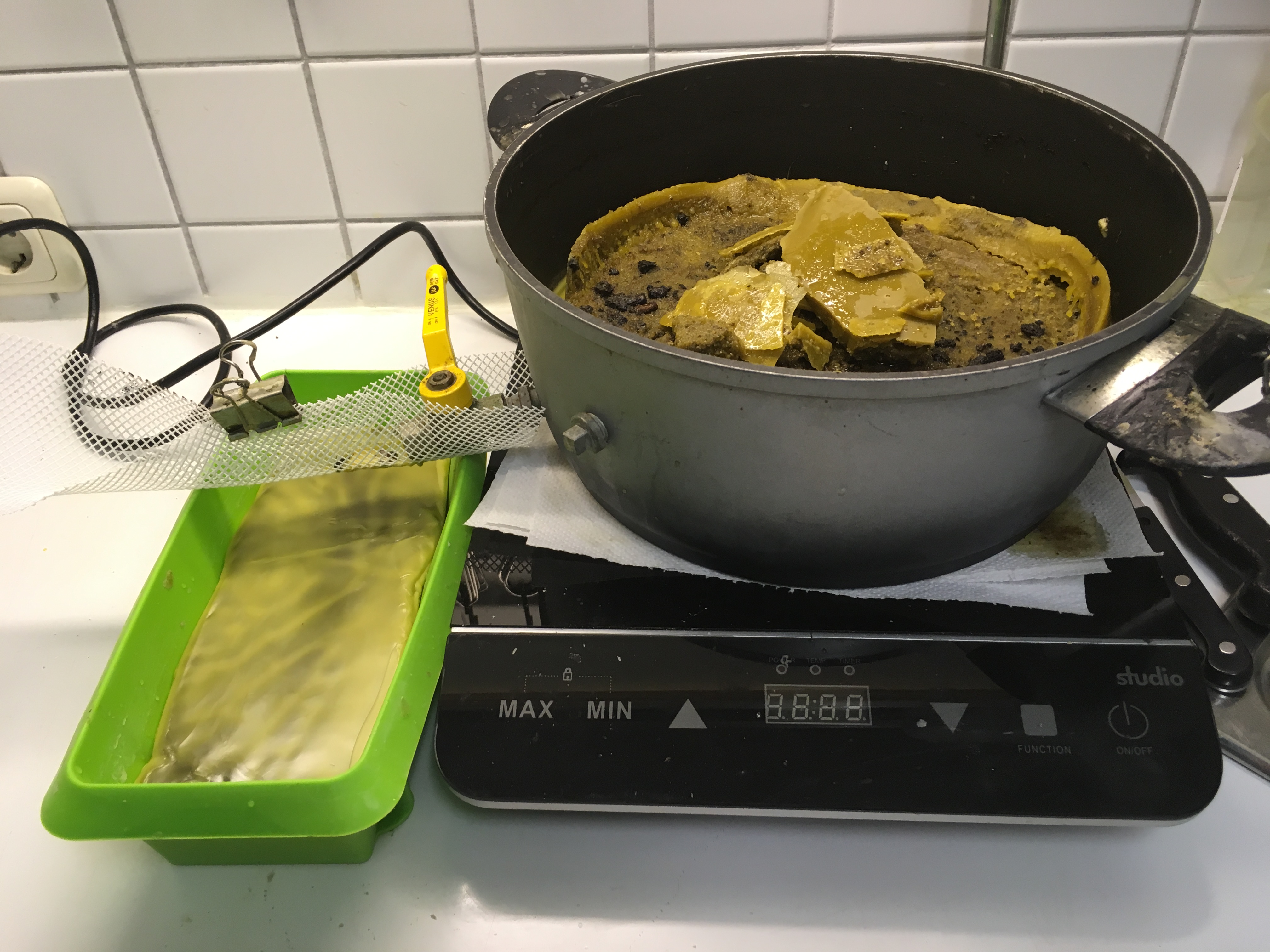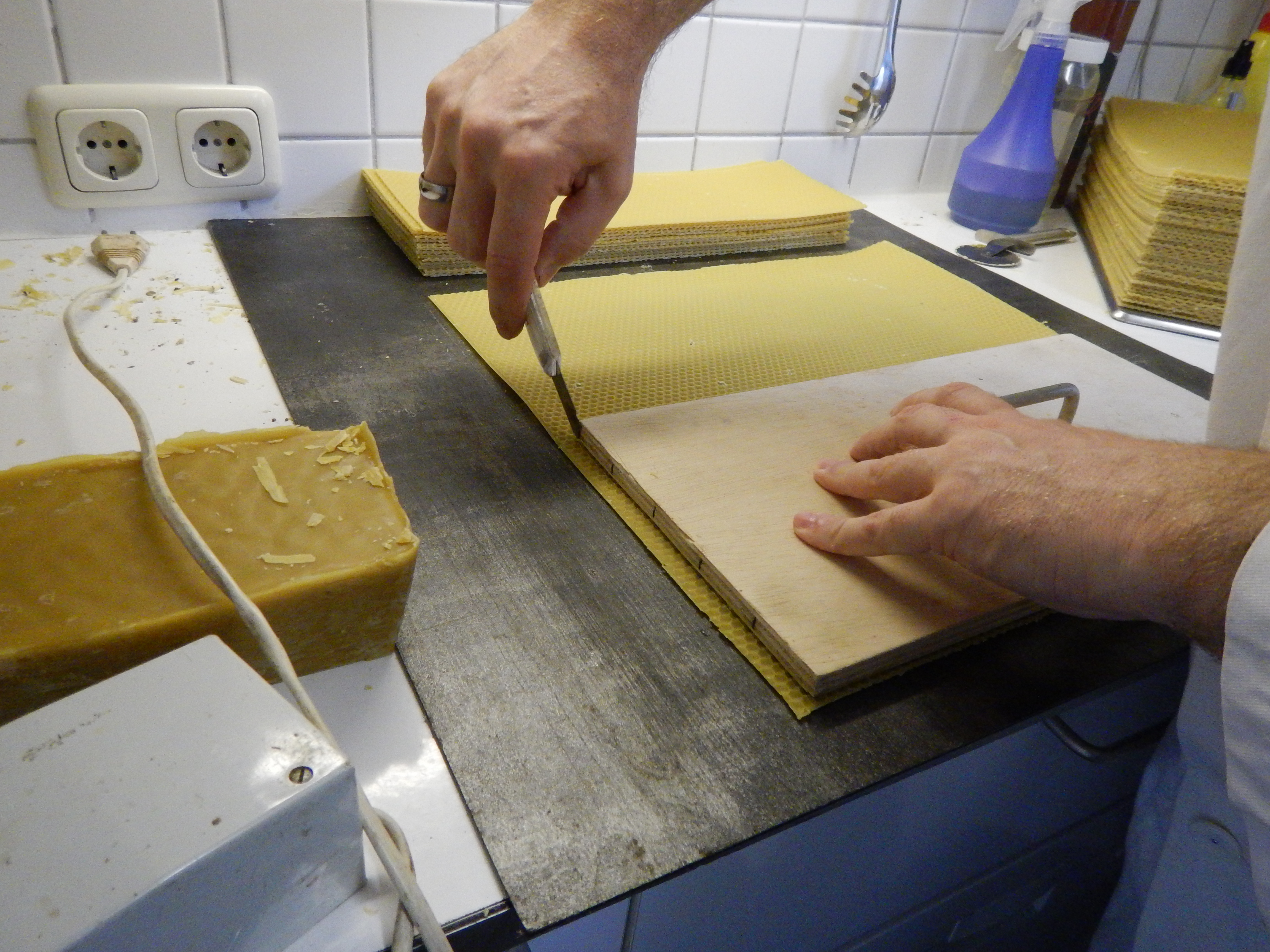 Wie schon letztes Jahr beschrieben wird hier das Bienenwachs mit 160°C entkeimt und anschließend mit der Mittelwandpresse zu Mittelwänden gepresst. Ihr kennt diese Mittelwände sicher von den gedrehten Kerzen. Wenn sie abgekühlt sind werden sie mit der Schablone in zwei unterschiedliche Größen geschnitten: Zander Normal 20x40cm kommt in den Brutraum, Zander Flach 12x40cm kommt in den Honigraum.