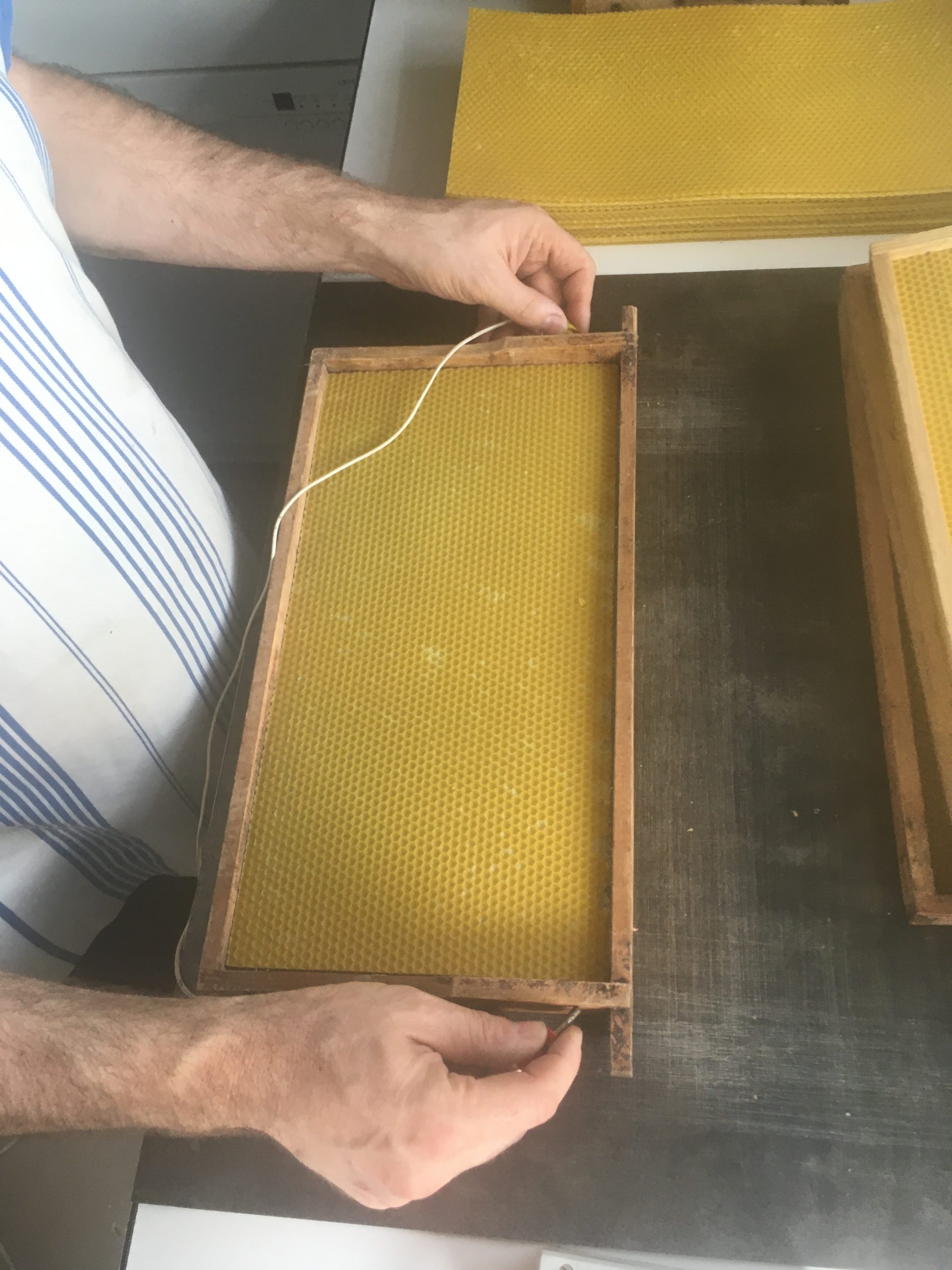 Nun werden die neuen Mittelwände in die gereinigten Rähmchen eingelötet.