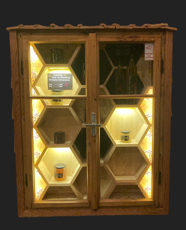 Ein weiteres Highlight in unserer Imkerei ist unser neuer 24Stunden/7 Tage Shop neben unsere Haustüre in Pasching , derzeit haben wir Ihn mit verschiedenen Honigen und „Saurer Versuchung“ bestückt. Ihr könnt euch also jederzeit unsere Produkte kaufen, solltet Ihr jedoch größere Mengen brauchen oder andere Produkte, einfach melden.