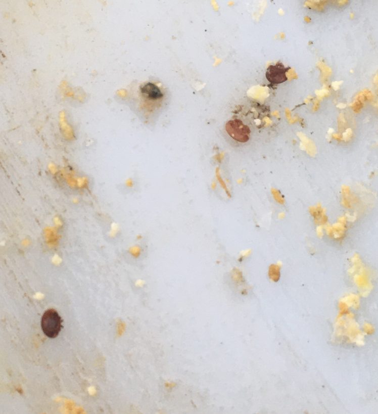 Entfernt man das Dach sieht man bereits sehr deutlich dass die Bienen in der Wintertraube zusammengefunden haben und sich langsam in Ihren Futtervorrat hineinfressen. Die Königin beendete Ihre Eiablage bei den fallenden Temperaturen Mitte November, und die noch zu wärmende Brut läuft schön langsam aus. Man sieht auch dass noch einige Milben abfallen.