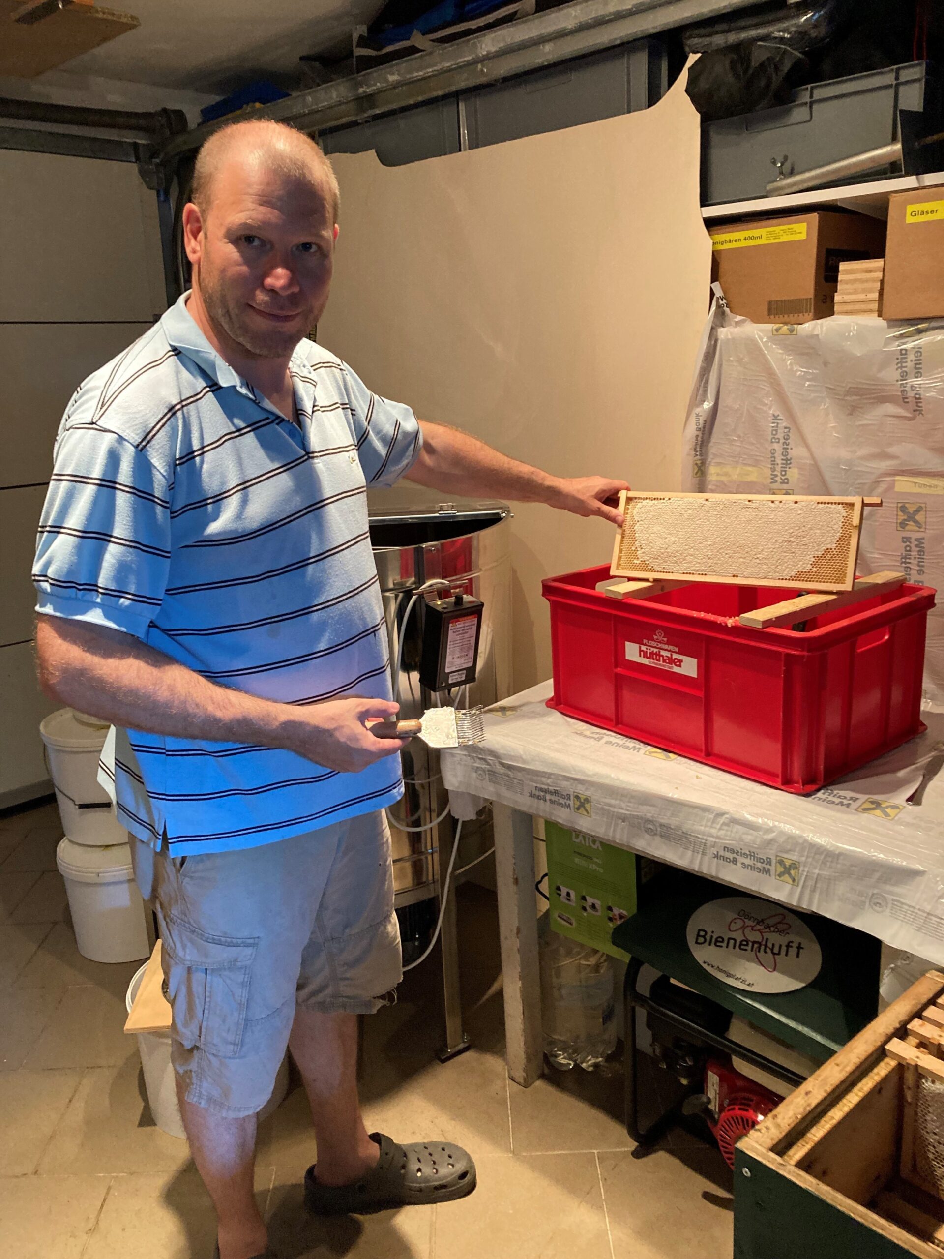 Aufgrund des warmen Wetters konnte die Honigernte gestartet werden. . Die Honigwaben sind gut verdeckelt und das süße Gold wird mit der Honigschleuder geerntet. Zuerst waren die Patenstöcke der Bienenpaten aus der BIO-Apfelplantage und des Kürbergerwaldes an der Reihe. Dann folgten die anderen Völker.