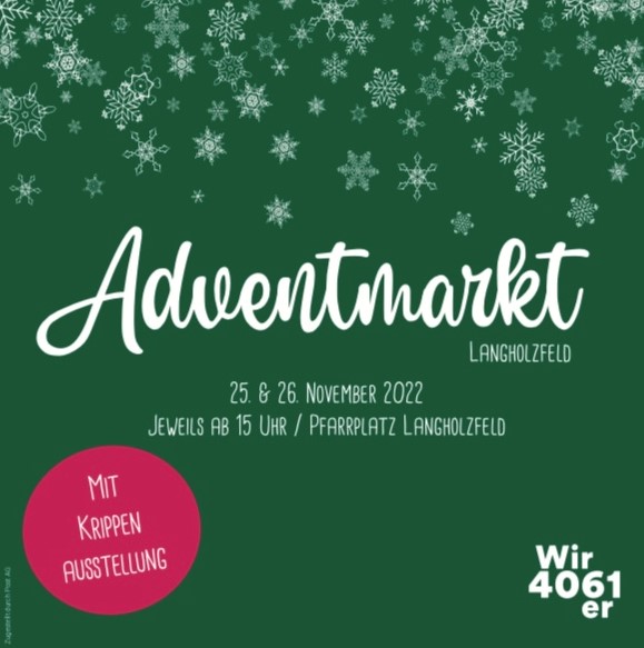 Die Vorweihnachtszeit ist voll angelaufen und die ersten Adventmärkte beginnen. Ich wollte euch darüber informieren das wir heuer am Adventmarkt in Langholzfeld von 25-26.11.22 am Pfarrplatz Langholzfeld im Pfarrheim sind. Beginn ist um 15:00, Ende ist um 21:00 Uhr.